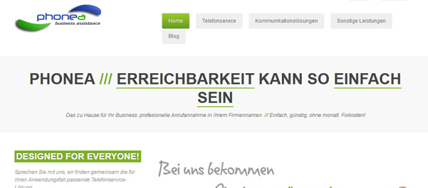 Phonea business assistance ist ein bundesweiter Telefon- und Sekretariatsservice mit Firmensitz in Stolberg im Rheinland. Der Anbieter besticht mit professionell ausgebildeten, freundlichen Sekretärinnen, die Anrufe sowohl in deutsch als auch in englisch entgegen nehmen können. Phonea bietet neben dem klassischen Telefonservice (virtuelles Sekretariat) noch weitere interessante Dienste wie z.B. einen Inkasso-Service, Fax to E-Mail, Click2Call-Button, Bonitätsauskünfte und mehr. Kunden erhalten dadurch einen umfassenden Service vergleichbar mit einem voll ausgestatteten Sekretariat.